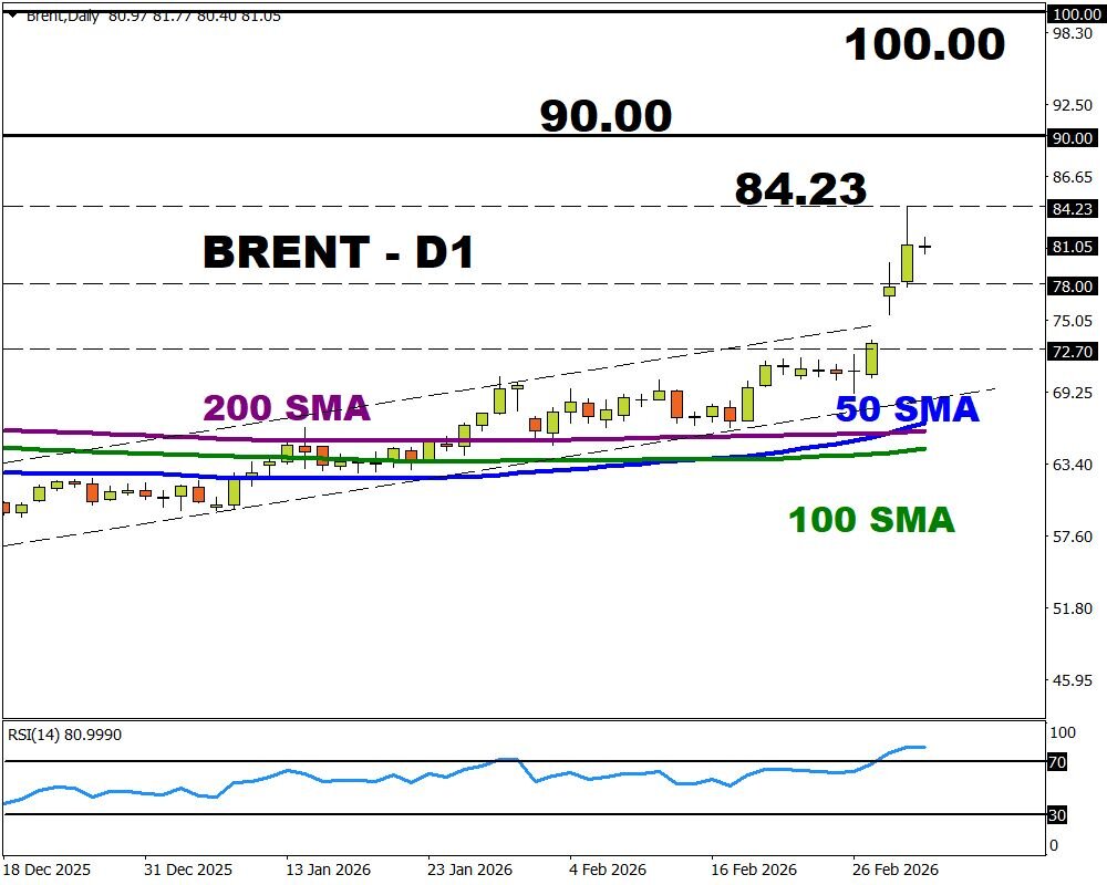 Bullish Scenario: The direct military escalation in the Middle East has led to the closure of the Strait of Hormuz. Any supply shock could drive Brent toward $90 and $100.